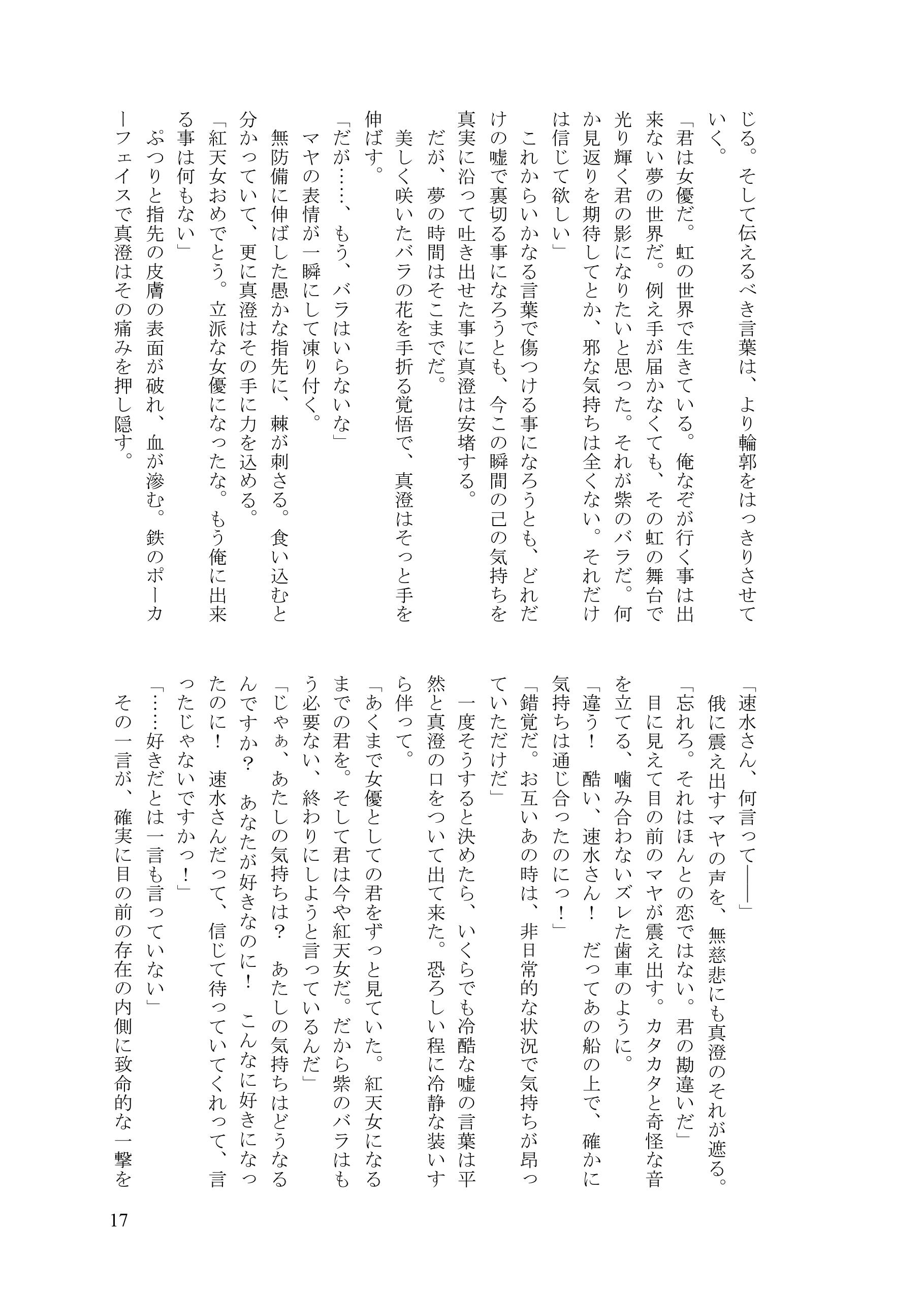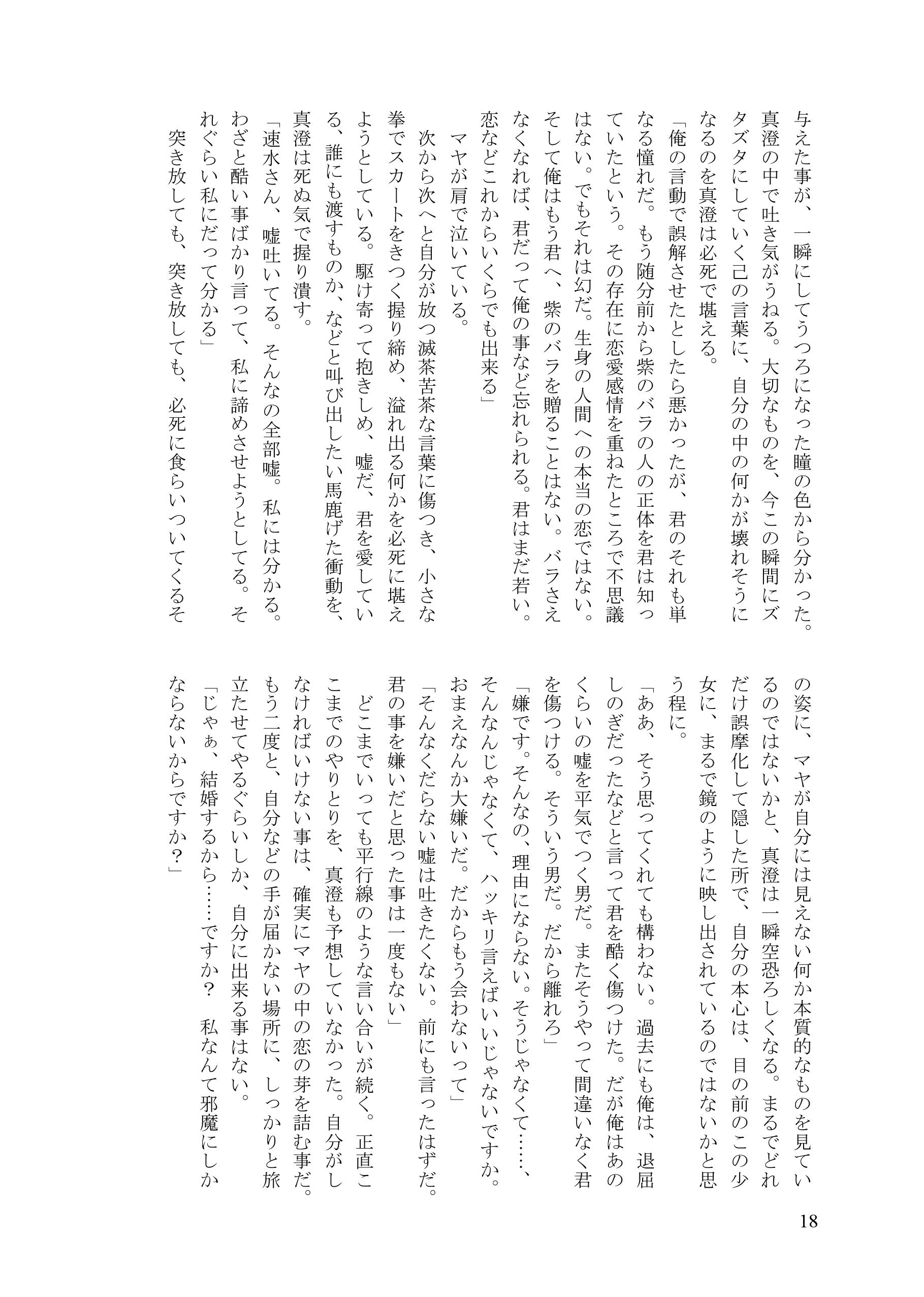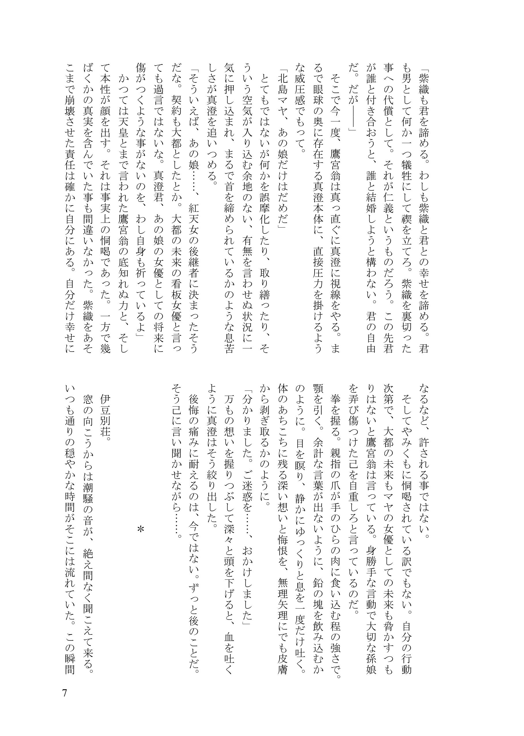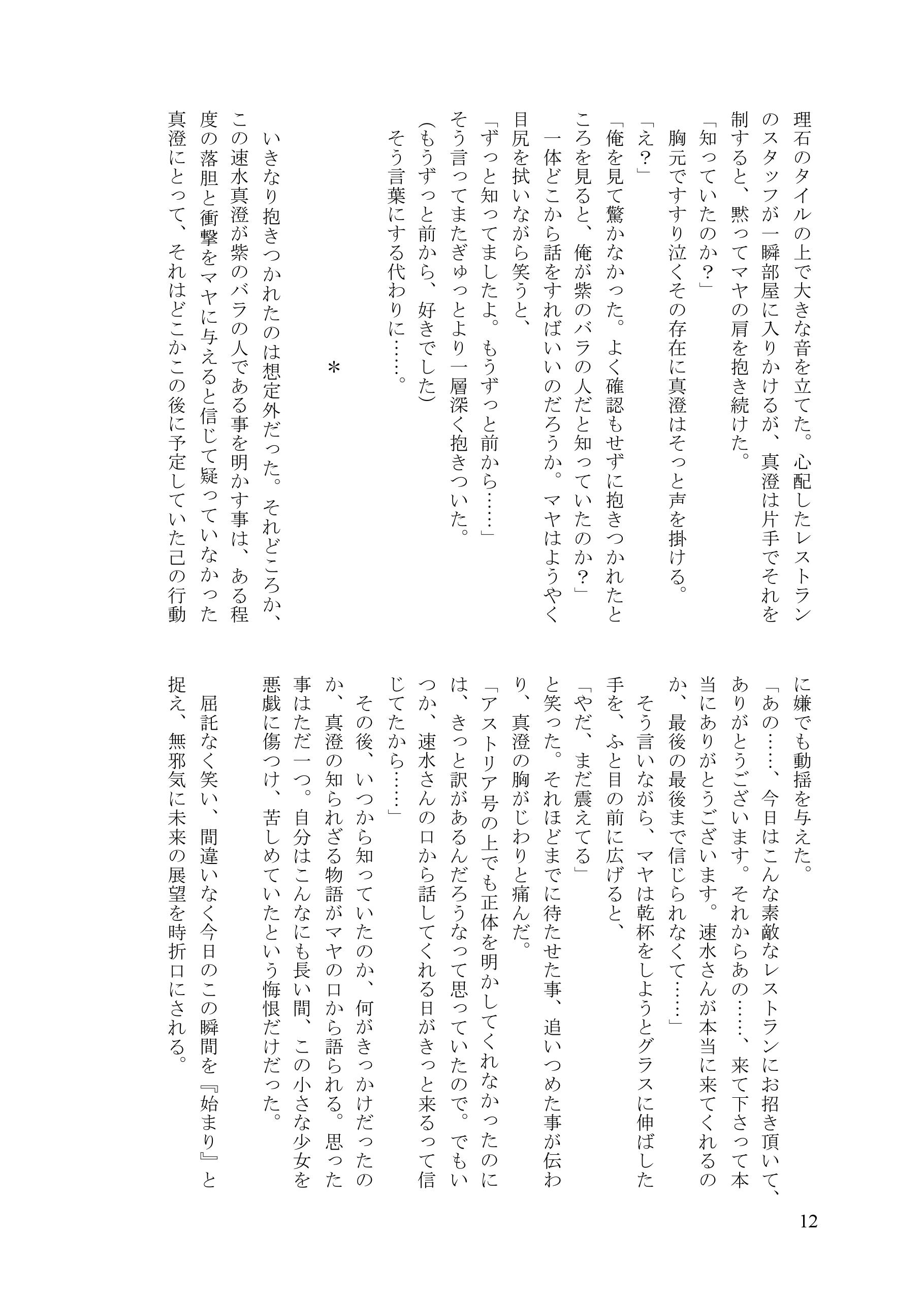 | 【あらすじ】 紫織との婚約は破棄したものの、鷹宮翁から出さ れた破談の条件により、自由になる事は許されなかった真澄。 女優としてのマヤの立場を守るため、一度は突き放すが、何も知らず諦めきれないマヤに縋り付かれ、思い余ってマヤに愛人契約を持ちかけてしまう。 真澄の用意したマンションで、戸惑いながらも真澄の愛人になる事を受け入れるマヤ。 まるで水槽の中のように息苦しい密室にて、二人は快楽に溺れる一方、その歪み切った世界の中で、少しずつ何かが壊れていく……。 ********** 愛しかないのに愛だけがないと思い込んでいる二人の世界、再び。 気持ちだけすれ違いながら、けれどもほとんど二人の絡み合いばかりで進みます。 水の中で息を止めているような苦しさと、快楽の限界に翻弄される二人だけの世界、やがて訪れる崩壊、そして最後に差す真実の光。 私のお話の中では最長作品となりました全116ページの長編です。 ※原作準拠。49巻その後のストーリーです。 ※R18指定 イベント・通販ともに、18歳未満の方には頒布できません。 ※以下、冒頭サンプルです。 ![]() ![]() ![]() ![]() ![]() ![]() ![]() ![]() ![]() ![]() ![]() ![]() ![]() ![]() ![]() ![]() ![]() |